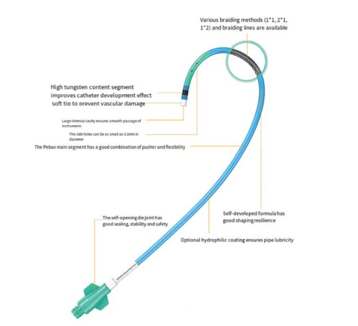 Tá ról ríthábhachtach ag an struchtúr braidithe sa chaitidéar. Ní hamháin go bhfeabhsaíonn sé airíonna meicniúla an chaititéar, ach feabhsaíonn sé freisin a ghluaiseacht agus a chobhsaíocht i dtimpeallachtaí soithíoch casta. Go sonrach, cruthaíonn an struchtúr braidithe blaosc le tacaíocht ard agus solúbthacht trí shocrú céimnithe de shreanga iolracha, rud a sholáthraíonn dea-fhrith-kink agus fórsa brú le linn an chaitidéar a chur chun cinn. Cuireann an dearadh struchtúrach seo ar chumas an chaitidéar a chruth a choinneáil sa soithigh fola agus é ag oiriúnú do lúbadh agus casadh an tsoithigh fola agus ag laghdú damáiste do bhalla na soithigh fola.