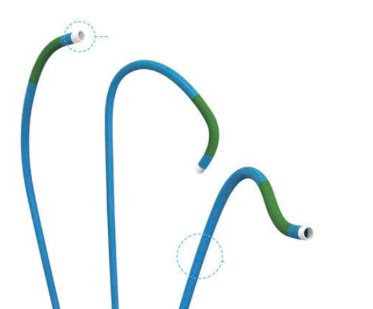 Feabhsaíonn an dearadh cruas il-leibhéil solúbthacht an chaitidéar agus an neart struchtúrach iomlán á chothabháil trí úsáid a bhaint as ábhair de chruas éagsúla ag codanna éagsúla den chaitidéar. Go sonrach, ceadaíonn an dearadh seo cruas níos airde a bheith ag an gcaitidéar ag an deireadh cóngarach (an deireadh gar don oibreoir) le haghaidh dul chun cinn agus ionramháil éasca, agus cruas níos ísle ag an deireadh distal (an deireadh gar don othar) chun a solúbthacht a fheabhsú ionas gur féidir é a oiriúnú níos fearr do chosáin soithíoch casta nó tortuous.